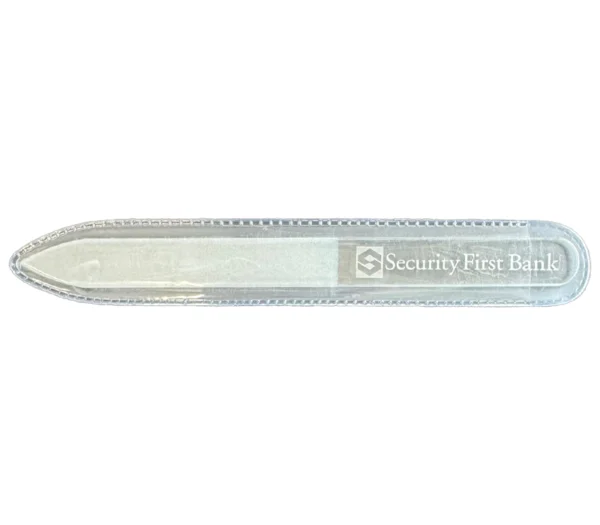 Tempered glass nail file with clear sleeve.  SFB logo